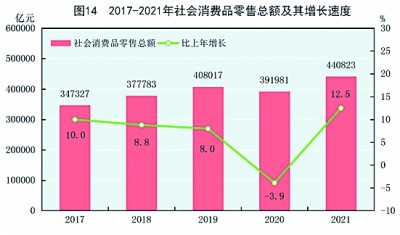 全年社會消費品零售總額440823億元,比上年增長12.5%。按經(jīng)營地統(tǒng)計,城鎮(zhèn)消費品零售額381558億元,增長12.5%;鄉(xiāng)村消費品零售額59265億元,增長12.1%。按消費類型統(tǒng)計,商品零售額393928億元,增長11.8%;餐飲收入額46895億元,增長18.6%。(見圖14)