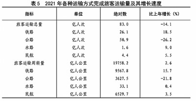 全年旅客運輸總量83億人次,比上年下降14.1%。旅客運輸周轉(zhuǎn)量19758億人公里,增長2.6%。(見表5)