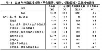 全年外商直接投資(不含銀行、證券、保險領(lǐng)域)新設(shè)立企業(yè)47643家,比上年增長23.5%。實際使用外商直接投資金額11494億元,增長14.9%,折1735億美元,增長20.2%。其中“一帶一路”沿線國家對華直接投資(含通過部分自由港對華投資)新設(shè)立企業(yè)5336家,增長24.3%;對華直接投資金額743億元,增長29.4%,折112億美元,增長36.0%。全年高技術(shù)產(chǎn)業(yè)實際使用外資3469億元,增長17.1%,折522億美元,增長22.1%。(見表13)