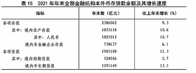 全年社會融資規(guī)模增量[45]31.4萬億元,按可比口徑計算,比上年少3.4萬億元。年末社會融資規(guī)模存量[46]314.1萬億元,按可比口徑計算,比上年末增長10.3%,其中對實體經(jīng)濟(jì)發(fā)放的人民幣貸款余額191.5萬億元,增長11.6%。年末全部金融機(jī)構(gòu)本外幣各項存款余額238.6萬億元,比年初增加20.2萬億元,其中人民幣各項存款余額232.3萬億元,增加19.7萬億元。全部金融機(jī)構(gòu)本外幣各項貸款余額198.5萬億元,增加20.1萬億元,其中人民幣各項貸款余額192.7萬億元,增加19.9萬億元。人民幣普惠金融貸款[47]余額26.5萬億元,增加5.0萬億元。(見表15)
