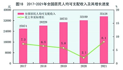 全年全國居民人均可支配收入35128元,比上年增長9.1%,扣除價格因素,實際增長8.1%。全國居民人均可支配收入中位數(shù)[53]29975元,增長8.8%。按常住地分,城鎮(zhèn)居民人均可支配收入47412元,比上年增長8.2%,扣除價格因素,實際增長7.1%。城鎮(zhèn)居民人均可支配收入中位數(shù)43504元,增長7.7%。農(nóng)村居民人均可支配收入18931元,比上年增長10.5%,扣除價格因素,實際增長9.7%。農(nóng)村居民人均可支配收入中位數(shù)16902元,增長11.2%。城鄉(xiāng)居民人均可支配收入比值為2.50,比上年縮小0.06。按全國居民五等份收入分組[54],低收入組人均可支配收入8333元,中間偏下收入組人均可支配收入18445元,中間收入組人均可支配收入29053元,中間偏上收入組人均可支配收入44949元,高收入組人均可支配收入85836元。全國農(nóng)民工人均月收入4432元,比上年增長8.8%。全年脫貧縣[55]農(nóng)村居民人均可支配收入14051元,比上年增長11.6%,扣除價格因素,實際增長10.8%。