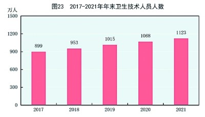 年末全國共有醫(yī)療衛(wèi)生機(jī)構(gòu)103.1萬個,其中醫(yī)院3.7萬個,在醫(yī)院中有公立醫(yī)院1.2萬個,民營醫(yī)院2.5萬個;基層醫(yī)療衛(wèi)生機(jī)構(gòu)97.7萬個,其中鄉(xiāng)鎮(zhèn)衛(wèi)生院3.5萬個,社區(qū)衛(wèi)生服務(wù)中心(站)3.6萬個,門診部(所)30.7萬個,村衛(wèi)生室59.9萬個;專業(yè)公共衛(wèi)生機(jī)構(gòu)1.3萬個,其中疾病預(yù)防控制中心3380個,衛(wèi)生監(jiān)督所(中心)2790個。年末衛(wèi)生技術(shù)人員1123萬人,其中執(zhí)業(yè)醫(yī)師和執(zhí)業(yè)助理醫(yī)師427萬人,注冊護(hù)士502萬人。醫(yī)療衛(wèi)生機(jī)構(gòu)床位957萬張,其中醫(yī)院748萬張,鄉(xiāng)鎮(zhèn)衛(wèi)生院144萬張。全年總診療人次[70]85.3億人次,出院人數(shù)[71]2.4億人。截至年末,全國累計報告新型冠狀病毒肺炎確診病例102314例,累計治愈出院病例94792例,累計死亡4636人。全國累計報告接種新型冠狀病毒疫苗283533萬劑次。全國共有11937家醫(yī)療衛(wèi)生機(jī)構(gòu)提供新型冠狀病毒核酸檢測服務(wù),總檢測能力達(dá)到4168萬份/天。(見圖23)