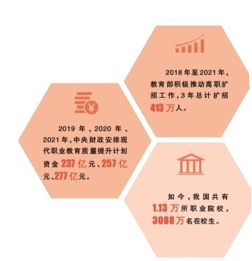 服務(wù)地方發(fā)展,還有實(shí)打?qū)嵉臄?shù)字支撐。2019年高職擴(kuò)招116.5萬(wàn)人、2020年高職擴(kuò)招157.4萬(wàn)人、2021年高職擴(kuò)招139.4萬(wàn)人,他們中有退役軍人、下崗失業(yè)人員、農(nóng)民工。高職擴(kuò)招為社會(huì)培養(yǎng)高素質(zhì)技術(shù)技能人才的同時(shí),也有效緩解了嚴(yán)峻的就業(yè)形勢(shì)。