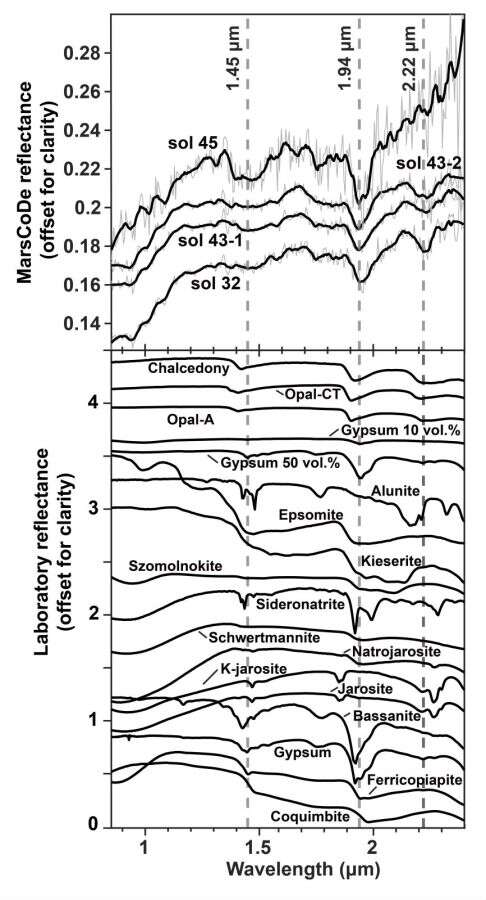 劉洋研究員和合作者通過(guò)對(duì)祝融號(hào)火星表面成分探測(cè)器獲取的短波紅外光譜和導(dǎo)航與地形相機(jī)數(shù)據(jù)進(jìn)行分析,發(fā)現(xiàn)了一種形貌上類(lèi)似沉積巖的巖石類(lèi)型——板狀的亮色巖石。這些板狀巖石通常部分被灰塵和土壤覆蓋,顯示出剝落的表面,表明受到熱應(yīng)力和風(fēng)成作用的物理風(fēng)化。研究人員利用短波紅外光譜在這些亮色板狀巖石中探測(cè)到了之前軌道數(shù)據(jù)在該區(qū)域沒(méi)有識(shí)別到的含水礦物,這些光譜具有~1.9μm和~2.2μm吸收特征,推測(cè)其為含水硅或含水硫酸鹽。