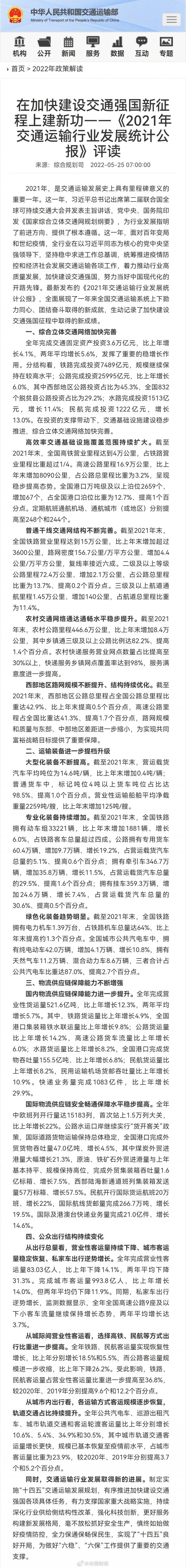 今天(25日),交通運(yùn)輸部發(fā)布《2021年交通運(yùn)輸行業(yè)發(fā)展統(tǒng)計(jì)公報(bào)》。2021年我國(guó)完成交通固定資產(chǎn)投資3.6萬(wàn)億元,比2020年增長(zhǎng)4.1%,分結(jié)構(gòu)看,鐵路完成投資7489億元,規(guī)模繼續(xù)保持在較高水平。截至2021年末,我國(guó)高鐵營(yíng)業(yè)里程達(dá)到4萬(wàn)公里,占鐵路營(yíng)業(yè)里程比重超過(guò)1/4。此外,我國(guó)農(nóng)村交通網(wǎng)絡(luò)通達(dá)通暢水平穩(wěn)步提升。去年,我國(guó)農(nóng)村公路里程446.6萬(wàn)公里,比2020年增加8.4萬(wàn)公里。農(nóng)村快遞服務(wù)營(yíng)業(yè)網(wǎng)點(diǎn)數(shù)量占比提高至30%以上,快遞服務(wù)鄉(xiāng)鎮(zhèn)網(wǎng)點(diǎn)覆蓋率達(dá)到98%,服務(wù)滿意度進(jìn)一步提高。