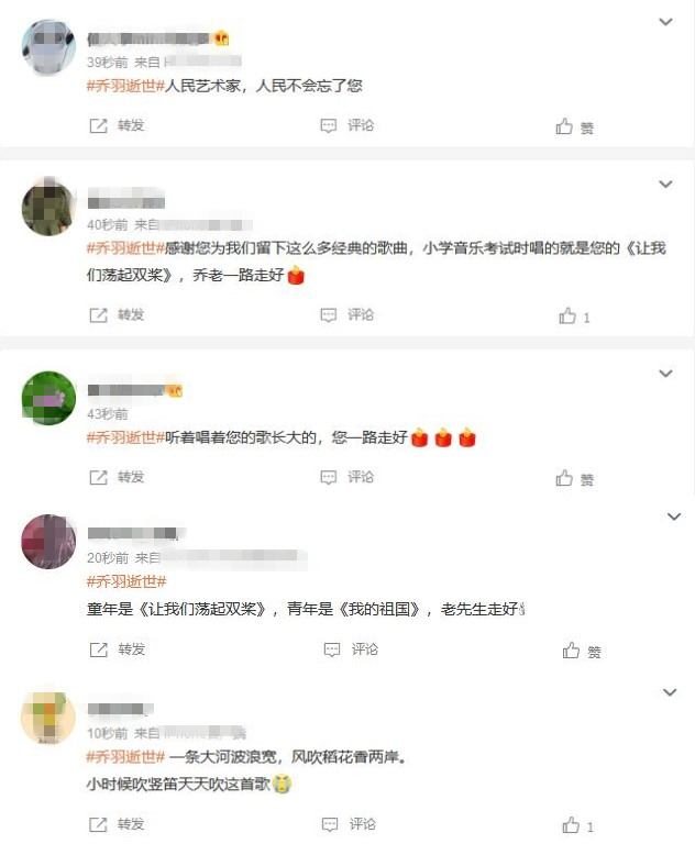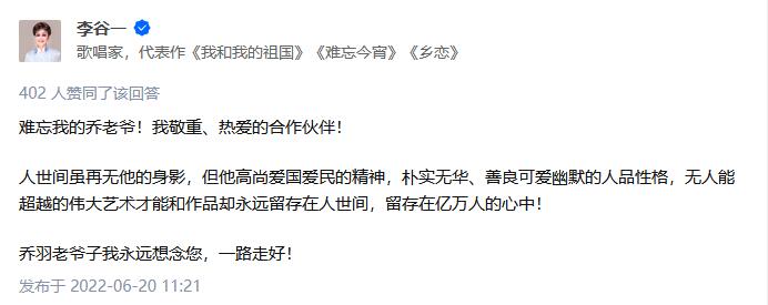 李谷一在聽聞喬羽逝世的消息后,第一時(shí)間發(fā)文悼念:“難忘我的喬老爺!我敬重、熱愛的合作伙伴!人世間雖再無他的身影,但他高尚愛國(guó)愛民的精神,樸實(shí)無華、善良可愛幽默的人品性格,無人能超越的偉大藝術(shù)才能和作品卻永遠(yuǎn)留存在人世間,留存在億萬(wàn)人的心中!喬羽老爺子我永遠(yuǎn)想念您,一路走好!”