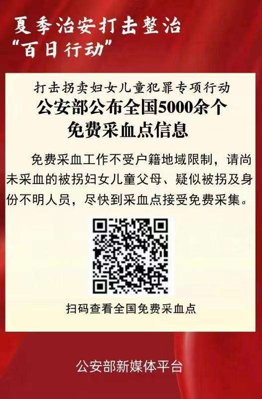 公安部公布全國5000余個免費(fèi)采血點(diǎn)信息 助力被拐家庭早日實(shí)現(xiàn)團(tuán)圓 免費(fèi)采血工作不受戶籍地域限制