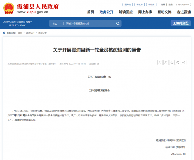 央視網(wǎng)消息:據(jù)霞浦縣人民政府網(wǎng)站消息,福建省寧德市霞浦縣應(yīng)對(duì)新冠肺炎疫情工作領(lǐng)導(dǎo)小組(指揮部)7月3日發(fā)布通報(bào), 7月3日5時(shí)30分,經(jīng)初步篩查,霞浦縣發(fā)現(xiàn)1例新冠肺炎核酸檢測(cè)初篩陽性。為切實(shí)保障廣大市民身體健康和生命安全,霞浦縣應(yīng)對(duì)新冠肺炎疫情工作領(lǐng)導(dǎo)小組(指揮部)決定于7月3日12時(shí)在全縣范圍內(nèi)開展新一輪全員核酸檢測(cè)工作。