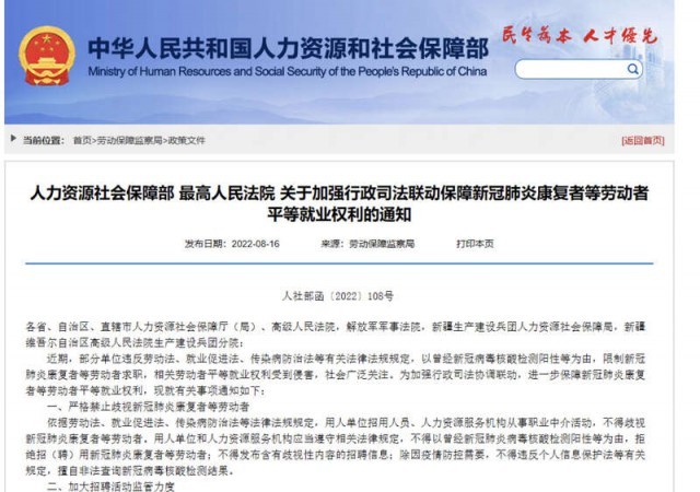 中國青年報客戶端北京8月16日電(中青報·中青網(wǎng)記者 李桂杰)人力資源和社會保障部、最高人民法院今天發(fā)布《關(guān)于加強行政司法聯(lián)動保障新冠肺炎康復者等勞動者平等就業(yè)權(quán)利的通知》(以下簡稱《通知》),再次重申嚴格禁止歧視新冠肺炎康復者等勞動者,并就加強就業(yè)歧視案件審理工作作出部署。