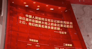 △“紀(jì)念中國(guó)人民志愿軍抗美援朝出國(guó)作戰(zhàn)70周年主題展覽”,紅色玻璃幕墻上鐫刻著抗美援朝英烈模范的姓名。