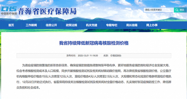據(jù)青海省醫(yī)療保障局網(wǎng)站消息,為適應(yīng)疫情防控面臨的新形勢新任務(wù),確保疫情防控措施調(diào)整轉(zhuǎn)段平穩(wěn)有序,更好地服務(wù)疫情防控和經(jīng)濟(jì)社會發(fā)展大局,綜合考慮核酸檢測成本及人口規(guī)模,同步開展核酸檢測試劑及相關(guān)耗材聯(lián)動限價(jià)掛網(wǎng),再次降低青海省核酸檢測價(jià)格,公立醫(yī)療機(jī)構(gòu)核酸單檢價(jià)格由15元/人次降至12元/人次,混檢價(jià)格由4元/人次降至2.5元/人次,大規(guī)模和常態(tài)化檢測價(jià)格參照混檢價(jià)格執(zhí)行,12月22日開始正式執(zhí)行。省醫(yī)保局持續(xù)關(guān)注核酸檢測試劑及相關(guān)耗材全國價(jià)格動態(tài),扎實(shí)做好新冠疫情防控工作,降低群眾負(fù)擔(dān)和社會成本。