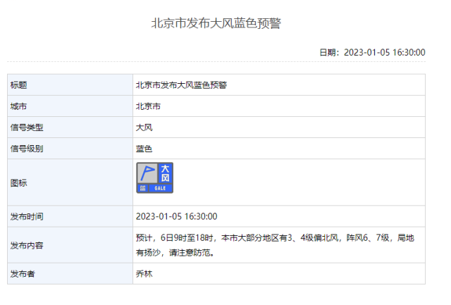 央視網(wǎng)消息:據(jù)北京氣象局網(wǎng)站消息,2023年01月05日16時30分,北京市氣象臺發(fā)布大風藍色預警。