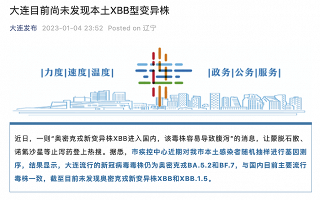 央視網(wǎng)消息:“大連發(fā)布”微信公眾號(hào)1月4日消息,近日,一則“奧密克戎新變異株XBB進(jìn)入國內(nèi),該毒株容易導(dǎo)致腹瀉”的消息,讓蒙脫石散、諾氟沙星等止瀉藥登上熱搜。據(jù)悉,大連市疾控中心近期對全市本土感染者隨機(jī)抽樣進(jìn)行基因測序,結(jié)果顯示,大連流行的新冠病毒毒株仍為奧密克戎BA.5.2和BF.7,與國內(nèi)目前主要流行毒株一致,截至目前未發(fā)現(xiàn)奧密克戎新變異株XBB和XBB.1.5。