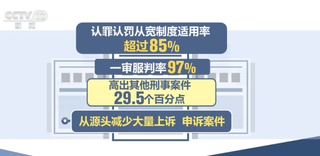 全面準(zhǔn)確貫徹寬嚴(yán)相濟(jì)刑事政策,深入落實少捕慎訴慎押刑事司法政策,認(rèn)罪認(rèn)罰從寬制度適用率超過85%,一審服判率97%,高出其他刑事案件29.5個百分點,從源頭減少了大量上訴、申訴案件。