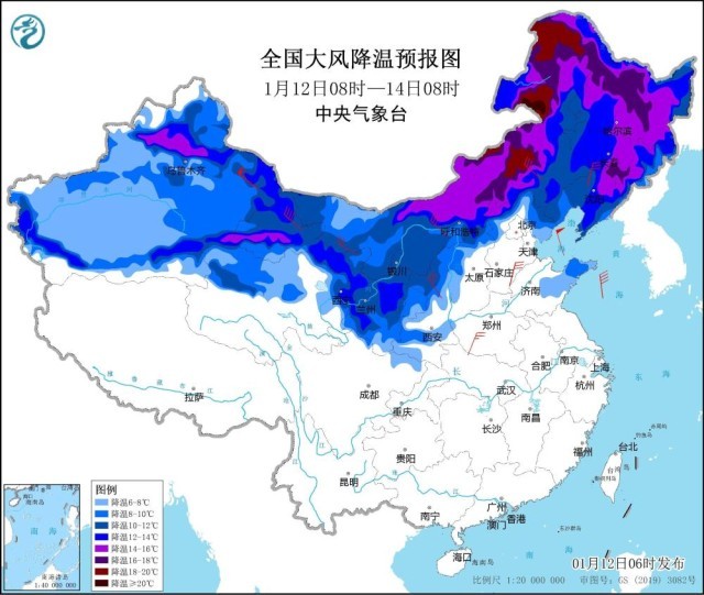 預(yù)計(jì),1月12日8時(shí)至1月14日8時(shí),新疆沿天山以北、甘肅大部、寧夏、陜西北部、內(nèi)蒙古大部、東北地區(qū)等地部分地區(qū)將先后降溫8~12℃,其中,新疆沿天山以北、內(nèi)蒙古中東部、黑龍江中東部、吉林東部、遼寧東北部等地部分地區(qū)降溫14~16℃,局地可超過18~20℃。新疆東部、甘肅中西部、內(nèi)蒙古大部、東北地區(qū)、華北等地有6~8級(jí)大風(fēng),新疆山口風(fēng)力可達(dá)9~11級(jí)或以上。東部海區(qū)有7~9級(jí)風(fēng),陣風(fēng)可達(dá)10~11級(jí)。新疆東部和南部、青海西北部、甘肅西部和東部、內(nèi)蒙古西部、寧夏、陜西北部等地有揚(yáng)沙或浮塵,局地有沙塵暴。