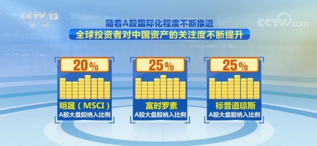 隨著A股國際化程度不斷推進,全球投資者對中國資產(chǎn)的關(guān)注度不斷提升。明晟(MSCI)、富時羅素和標(biāo)普道瓊斯的A股大盤股納入比例已分別達到20%、25%和25%。