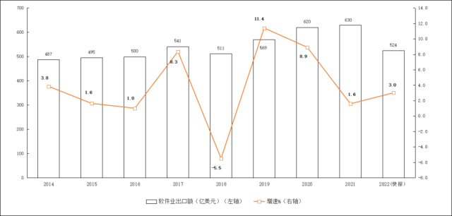 軟件業(yè)務(wù)出口保持增長。2022年,軟件業(yè)務(wù)出口524.1億美元,同比增長3.0%,增速較上年同期回落5.8個(gè)百分點(diǎn)。其中,軟件外包服務(wù)出口同比增長9.2%。