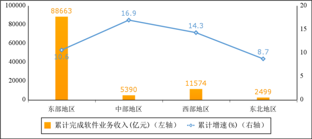 東部地區(qū)保持較快增長,中、西部地區(qū)增勢突出。2022年,東部、中部、西部和東北地區(qū)分別完成軟件業(yè)務(wù)收入88663億元、5390億元、11574億元和2499億元,分別同比增長10.6%、16.9%、14.3%和8.7%。其中,中部、西部地區(qū)高出全國平均水平5.7、3.1個(gè)百分點(diǎn)。四個(gè)地區(qū)軟件業(yè)務(wù)收入在全國總收入中的占比分別為82.0%、5.0%、10.7%和2.3%。