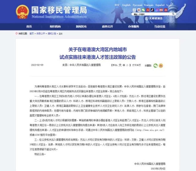 中國(guó)青年報(bào)客戶端北京2月9日電(中青報(bào)·中青網(wǎng)記者 何春中)中華人民共和國(guó)出入境管理局2月9日發(fā)布公告,為便利粵港澳大灣區(qū)人才從事科研學(xué)術(shù)交流活動(dòng),促進(jìn)服務(wù)粵港澳大灣區(qū)建設(shè)發(fā)展,自2023年2月20日起在粵港澳大灣區(qū)內(nèi)地城市試點(diǎn)實(shí)施往來港澳人才簽注政策。