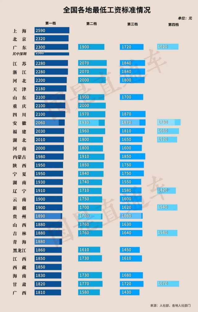 上述四地調(diào)整后,全國(guó)已有15個(gè)省份最低工資標(biāo)準(zhǔn)加入“2000元俱樂部”。其中上海最高,為2590元。緊隨其后的是:北京(2320元)、廣東(2300元,其中深圳2360元)。
