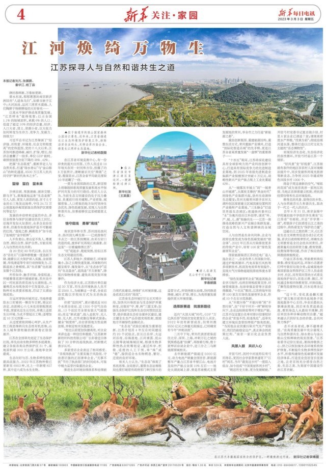 3月3日,新華每日電訊 新華關(guān)注·家園刊載題為《江河煥綺萬(wàn)物生 江蘇探尋人與自然和諧共生之道》的報(bào)道。