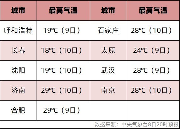 多地最高氣溫還將繼續(xù)突破紀(jì)錄。大城市中,呼和浩特、長(zhǎng)春、沈陽、濟(jì)南、合肥氣溫都可能刷新當(dāng)?shù)?月上旬最高紀(jì)錄,石家莊、太原、武漢、南京等地也會(huì)經(jīng)歷同期少見的暖。