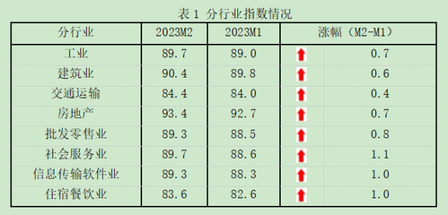 2月份,隨著經(jīng)濟逐步恢復(fù),8個行業(yè)指數(shù)均連續(xù)兩個月上升。服務(wù)業(yè)指數(shù)恢復(fù)速度領(lǐng)先,其中,社會服務(wù)業(yè)、信息傳輸計算機服務(wù)軟件業(yè)、住宿餐飲業(yè)和批發(fā)零售業(yè)指數(shù)分別上升1.1、1.0、1.0和0.8點。