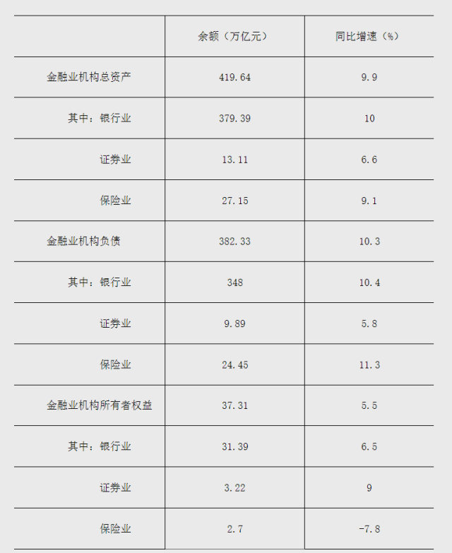 金融業(yè)機(jī)構(gòu)負(fù)債為382.33萬億元,同比增長10.3%,其中,銀行業(yè)機(jī)構(gòu)負(fù)債為348萬億元,同比增長10.4%;證券業(yè)機(jī)構(gòu)負(fù)債為9.89萬億元,同比增長5.8%;保險(xiǎn)業(yè)機(jī)構(gòu)負(fù)債為24.45萬億元,同比增長11.3%。