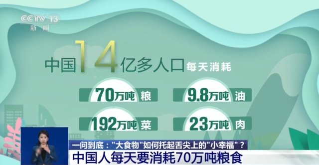 中國農(nóng)業(yè)科學(xué)院研究員 國家食物與營養(yǎng)咨詢委員會(huì)主任 陳萌山:過去我們吃飯,主要是主糧,一大碗米飯或者一點(diǎn)咸菜,一點(diǎn)辣椒。那么現(xiàn)在不一樣了,我們一小碗米飯很多菜,不僅僅是主食,副食老百姓要求更高。我們講直接消費(fèi)的口糧,已經(jīng)由1978年的人均248公斤,下降到目前的130公斤,所以副食也成為主食了。為了適應(yīng)這樣一個(gè)新的形勢,總書記提出“大食物觀”。