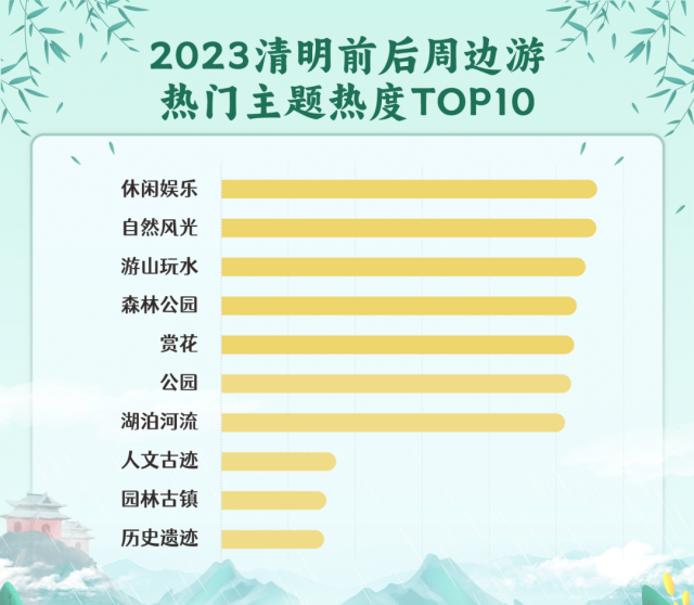 據(jù)某旅游票務(wù)平臺(tái)發(fā)布的《2023清明假期出游趨勢(shì)報(bào)告》,清明期間,本地及周邊短途出游是主流,出游主題上具有顯著的春游季特征?!秷?bào)告》顯示,清明假期(4月5日)前后周邊游的熱門主題按照熱度排序依次為休閑娛樂、自然風(fēng)光、游山玩水、森林公園、賞花、公園等。前十個(gè)熱門主題中,具有賞花踏青屬性的主題占據(jù)了六席。