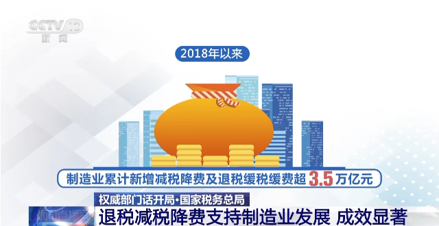 據(jù)介紹,在一系列退稅減稅降費舉措中,下調(diào)制造業(yè)等領域的增值稅稅率、率先提高制造業(yè)研發(fā)費用加計扣除比例、加大制造業(yè)增值稅留抵退稅力度等減負措施,有效支持了制造業(yè)緩解經(jīng)營壓力、增強創(chuàng)新動力、激活發(fā)展?jié)摿Α?/p>