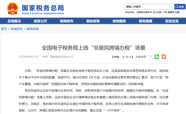 全國(guó)電子稅務(wù)局上線(xiàn)“非居民跨境辦稅”場(chǎng)景