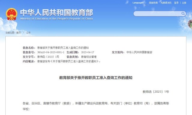 - 教育部發(fā)布《關(guān)于推開教職員工準(zhǔn)入查詢工作的通知》