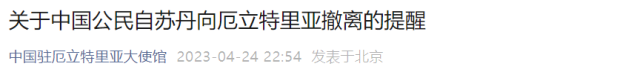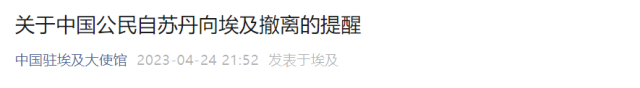 4月24日晚間,我國(guó)駐埃及使館發(fā)布關(guān)于中國(guó)公民自蘇丹向埃及撤離的提醒: