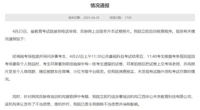 經(jīng)調(diào)閱考場視頻并詢問涉事考生,4月22日上午11:30公共基礎(chǔ)科目考試結(jié)束后,11:40考生根據(jù)考務(wù)規(guī)則返回考場拿取個人物品時,考生鄧某看到前排抽屜中有一張考生遺留的試卷,鄧某拍照后把試卷上交考場老師,并將照片發(fā)至個人微信群,隨后被群友在微博、小紅書等平臺轉(zhuǎn)發(fā)。經(jīng)江西省教育考試院調(diào)查核實(shí),未發(fā)現(xiàn)有試題外泄和考試作弊的情況。