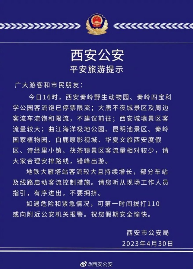 4月30日,西安多個景區(qū)停票限流。西安公安果斷發(fā)布旅游提示,不建議游客前往大唐不夜城,提示游客合理安排路線,錯峰出游。