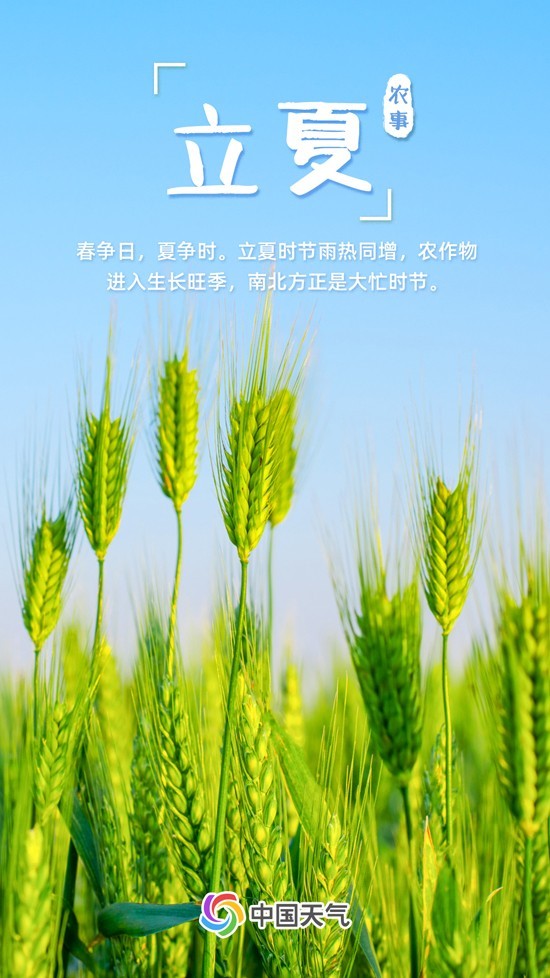 如果說春是生的季節(jié),那么夏就是長的季節(jié)?!稓v書》曰:“斗指東南,維為立夏,萬物至此皆長大,故名立夏也。”立夏,是標(biāo)示萬物進入旺季生長的一個重要節(jié)氣。此時,日照增加、氣溫漸升、雷雨增多,農(nóng)作物進入了茁壯成長階段。春播作物漸漸長大,夏收作物進入生長后期,冬小麥揚花灌漿,油菜接近成熟,大江南北都進入了農(nóng)事繁忙時期。