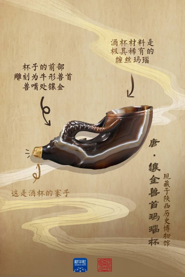 這件鑲金獸首瑪瑙杯,被列為我國禁止出境的珍貴文物之一。角狀杯體由一整塊極為罕見的紅色纏絲瑪瑙雕琢而成,整個杯體高6.5厘米,長15.6厘米,口徑5.6厘米,其造型與起源于古希臘的酒具“來通”相似,“來通”曾廣泛流行于中亞、西亞地區(qū),沿著絲綢之路不斷東傳進(jìn)入中國。