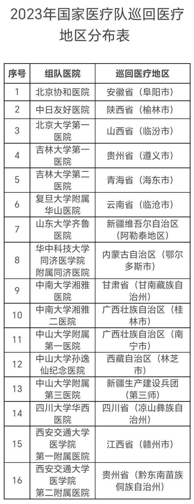 國家醫(yī)療隊的組隊醫(yī)院包括北京協(xié)和醫(yī)院、中日友好醫(yī)院等16家,分赴安徽、陜西等地,派出時間為6—10月。每支國家醫(yī)療隊不少于5人,以副高及以上職稱的醫(yī)務(wù)人員為主,重點開展巡回醫(yī)療、技術(shù)和管理指導(dǎo)、人員培訓(xùn)、加強(qiáng)遠(yuǎn)程醫(yī)療協(xié)作網(wǎng)建設(shè)等工作。工作時間不少于3周,其中在縣域開展工作的時間不少于兩周。
