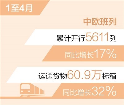 本報北京5月22日電 (記者李心萍)記者從中國國家鐵路集團(tuán)有限公司獲悉:今年1至4月,中歐班列累計(jì)開行5611列、運(yùn)送貨物60.9萬標(biāo)箱,同比分別增長17%、32%,重箱率100%。其中,4月單月開行1459列、運(yùn)送貨物16萬標(biāo)箱,同比分別增長25%、45%。