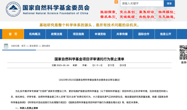 5月24日,國家自然科學(xué)基金委(以下簡(jiǎn)稱自然科學(xué)基金委)發(fā)布《國家自然科學(xué)基金項(xiàng)目評(píng)審請(qǐng)托行為禁止清單》,集中對(duì)科研人員、依托單位、評(píng)審專家、自然科學(xué)基金委工作人員等“四方主體”明確提出24項(xiàng)禁止行為。