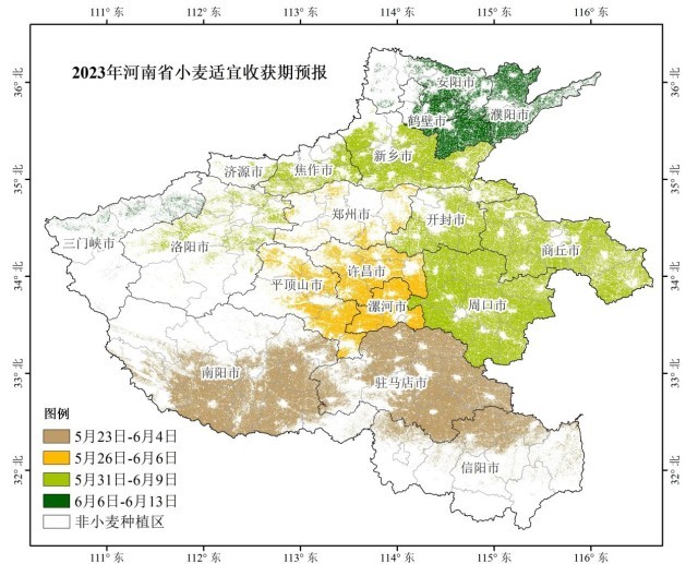 根據(jù)河南省氣象臺(tái)早前發(fā)布的消息,今年我省小麥適宜收獲期預(yù)計(jì)在5月23日-6月13日,大部地區(qū)接近常年,豫南地區(qū)略提前。其中:信陽、南陽、駐馬店適宜收獲期在5月23日-6月4日;漯河、平頂山、許昌、鄭州適宜收獲期在5月26日-6月6日;周口、商丘、開封、新鄉(xiāng)、焦作、洛陽、濟(jì)源適宜收獲期在5月31日-6月9日;三門峽、鶴壁、濮陽、安陽適宜收獲期在6月6日-13日。