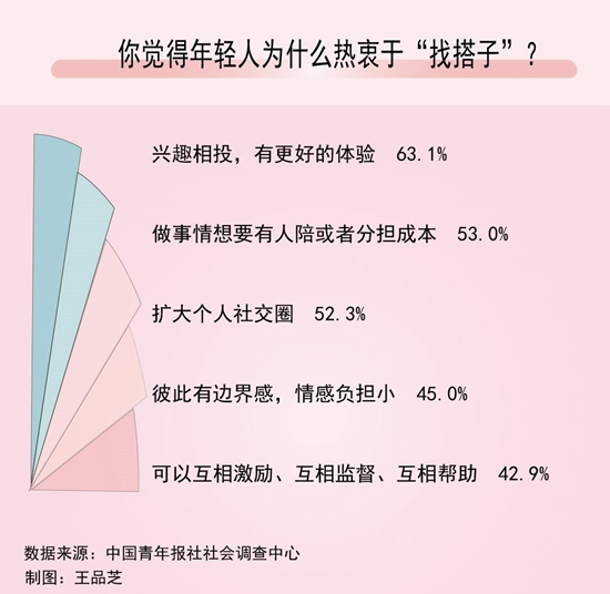 近日,中國青年報社社會調(diào)查中心聯(lián)合問卷網(wǎng)(wenjuan.com),對1335名受訪者進行的一項調(diào)查顯示,63.1%的受訪青年認為找“搭子”是因為興趣相投,有更好的體驗,53.0%的青年覺得是因為做事情想要有人陪或者分擔成本。