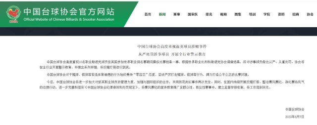 中國(guó)臺(tái)球協(xié)會(huì):將從嚴(yán)處罰旅英涉賭球員 開(kāi)展全行業(yè)警示教育