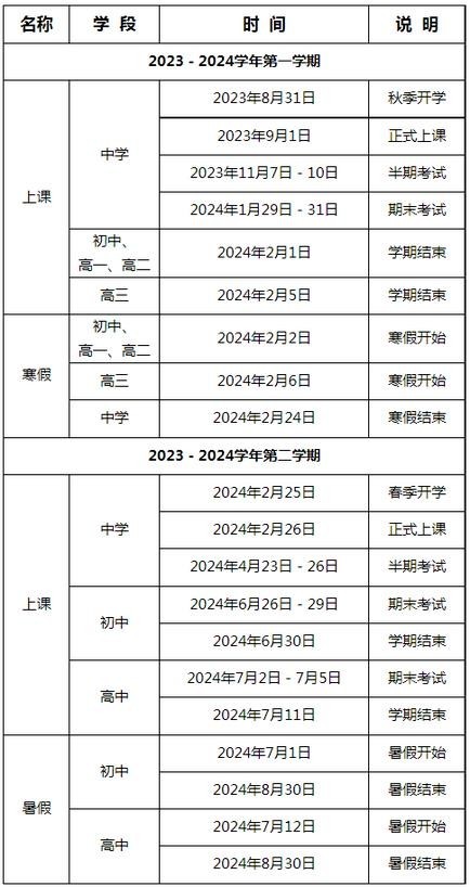 新學(xué)期開(kāi)學(xué)時(shí)間:秋季學(xué)期,高三年級(jí)于2023年8月24日開(kāi)學(xué);其他年級(jí)(含幼兒園)于8月31日?qǐng)?bào)名,9月1日正式上課。