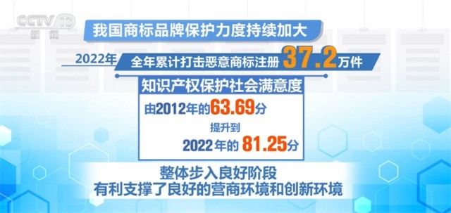 央視網(wǎng)消息:第十三屆中國國際商標(biāo)品牌節(jié)昨天(6月17日)在東莞開幕,國家知識產(chǎn)權(quán)局相關(guān)負(fù)責(zé)人介紹,我國商標(biāo)品牌保護(hù)力度持續(xù)加大,2022年全年累計(jì)打擊惡意商標(biāo)注冊37.2萬件,知識產(chǎn)權(quán)保護(hù)社會滿意度由2012年的63.69分提升到去年的81.25分,整體步入良好階段,有利支撐了良好的營商環(huán)境和創(chuàng)新環(huán)境。