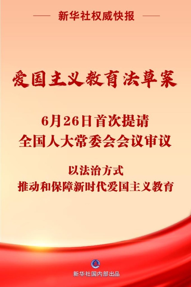 愛國主義教育法草案6月26日首次提請全國人大常委會會議審議。制定愛國主義教育法,以法治方式推動和保障新時代愛國主義教育,對于振奮民族精神、凝聚人民力量,推進(jìn)強(qiáng)國建設(shè)、民族復(fù)興,具有十分重大而深遠(yuǎn)的意義。