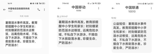 中國青年報客戶端北京7月13日電(中青報·中青網(wǎng)記者 樊未晨)記者今天從教育部獲悉,暑假來臨,教育部、工信部協(xié)調(diào)中國電信、中國移動、中國聯(lián)通三大運營商,向全國手機用戶發(fā)送了暑期防溺水公益短信,提醒廣大中小學(xué)生和家長增強安全意識,營造全社會關(guān)心支持預(yù)防學(xué)生溺水工作良好氛圍。