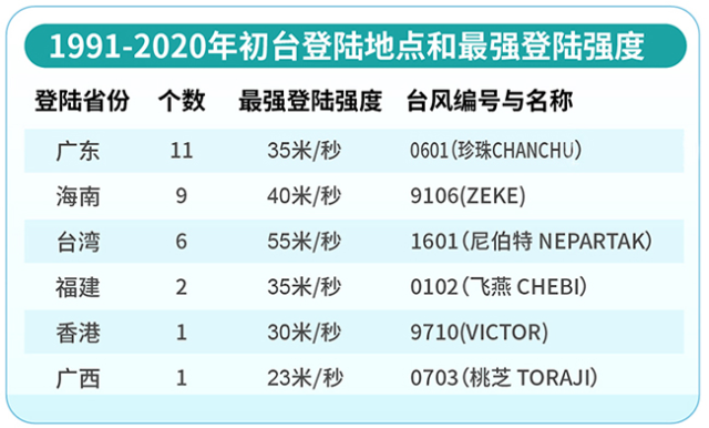 預(yù)計,臺風(fēng)“泰利”將在廣東陽江到海南文昌一帶沿海登陸,那么常年初臺更“青睞”在哪里“上岸”呢?通過常年統(tǒng)計數(shù)據(jù)我們可以看到,初臺一般在華南等低緯度沿海地區(qū)登陸,初臺最常登陸地為廣東?。?1個)、海南?。?個)和臺灣?。?個)。