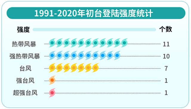 1991-2020年初臺登陸強(qiáng)度統(tǒng)計 丁茜制圖